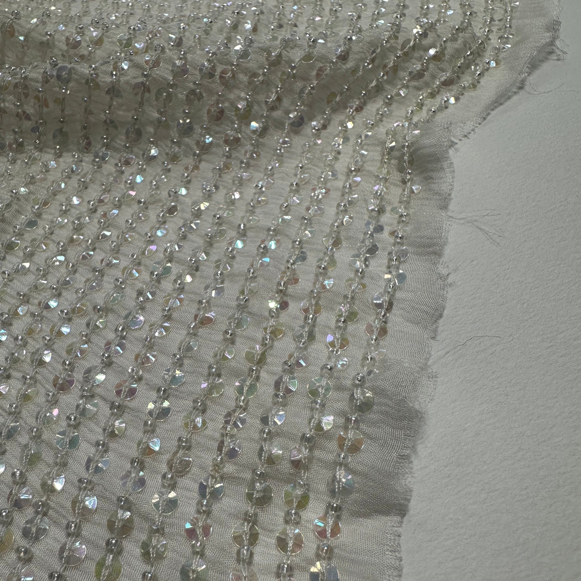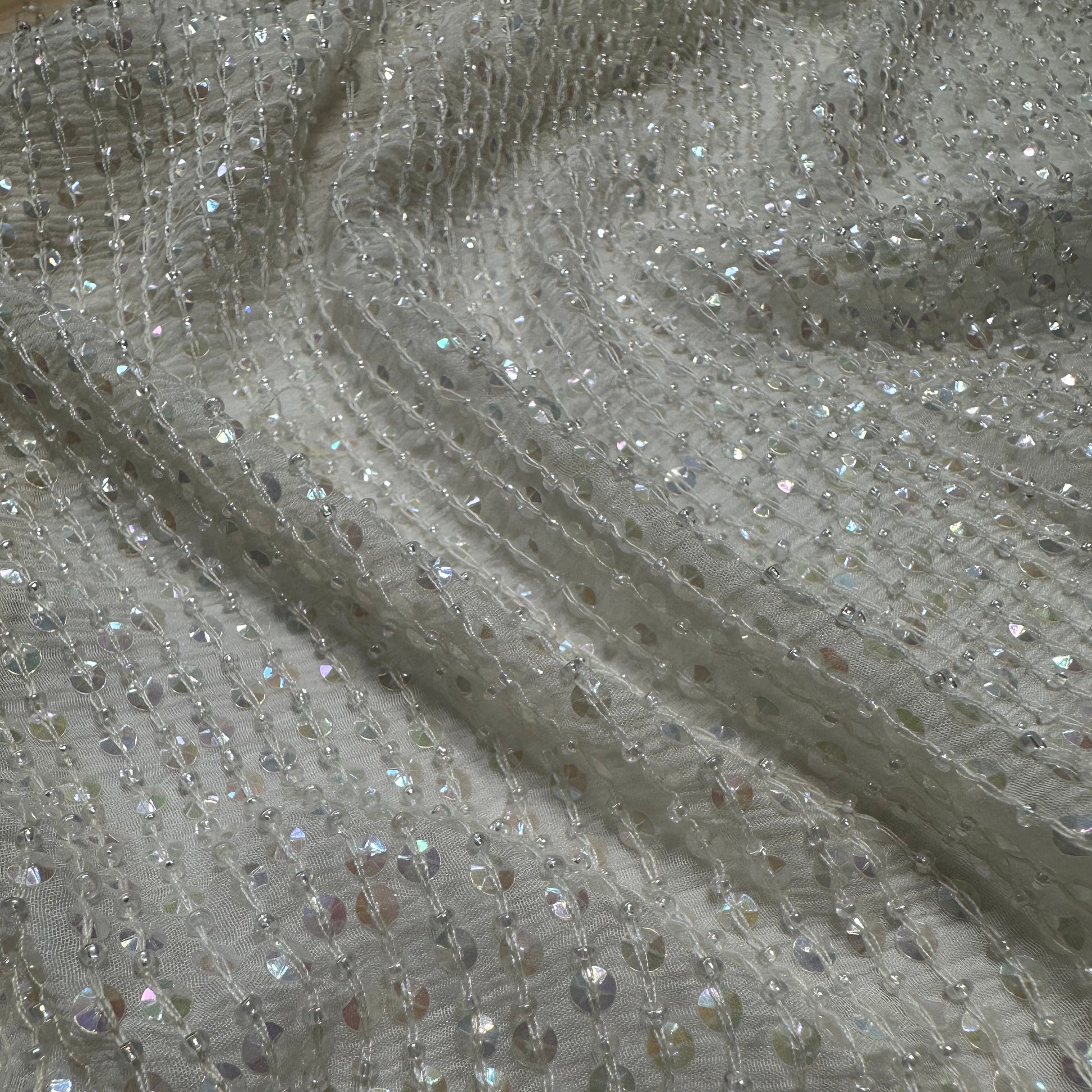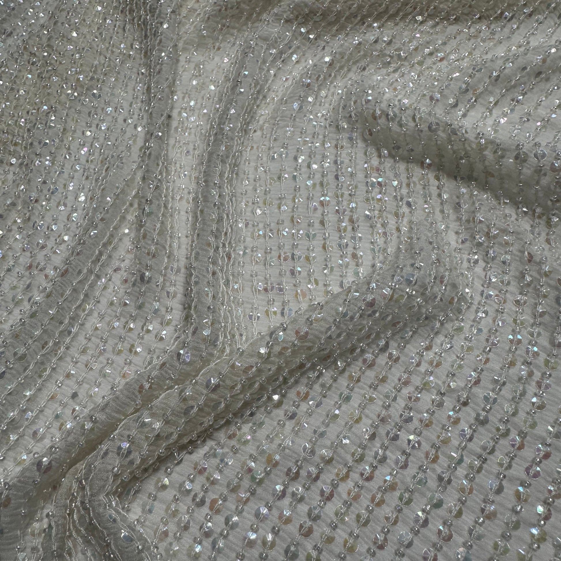 An all over sequinned & beaded fabric on ivory silk georgette. Sequin colour & bead size is uniform throughout, with a reflective sequin finish in clear.