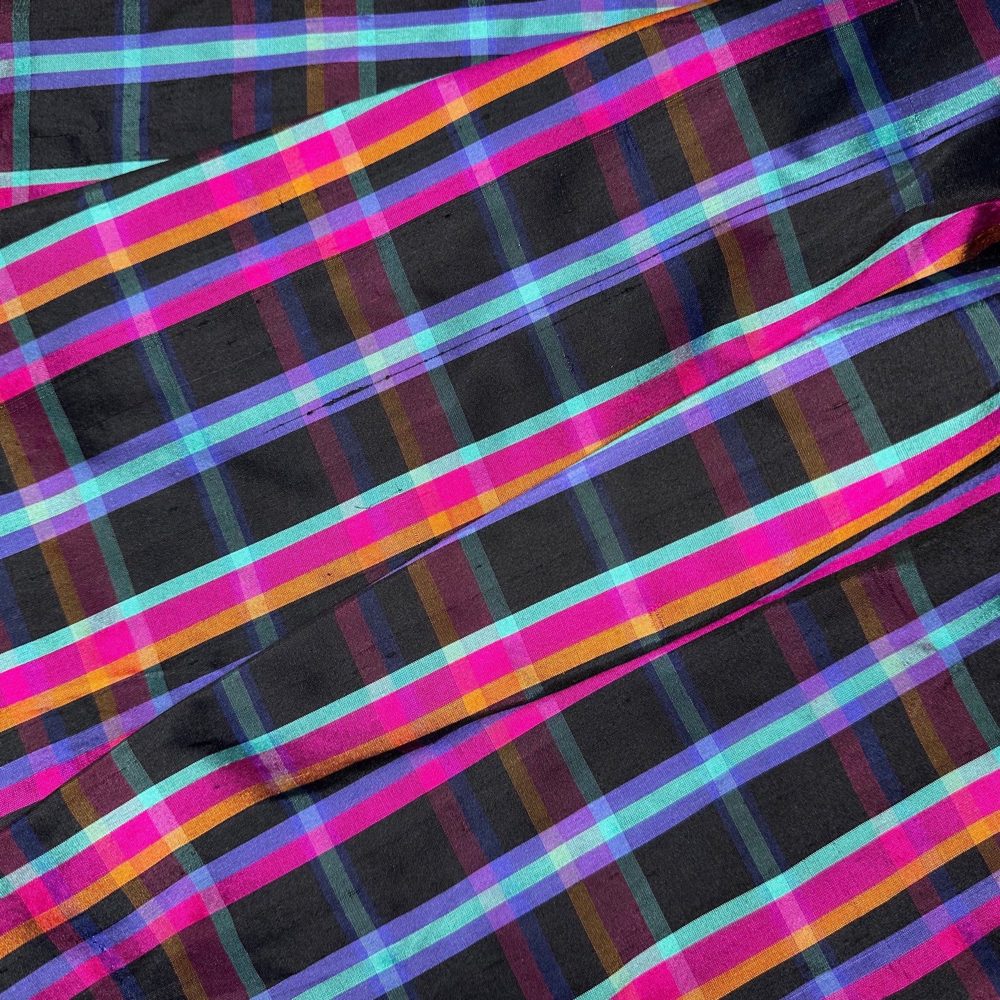 Bright check has bright pink, turquoise, purple and orange checks on a black base. It can be matched with many plain colours.
