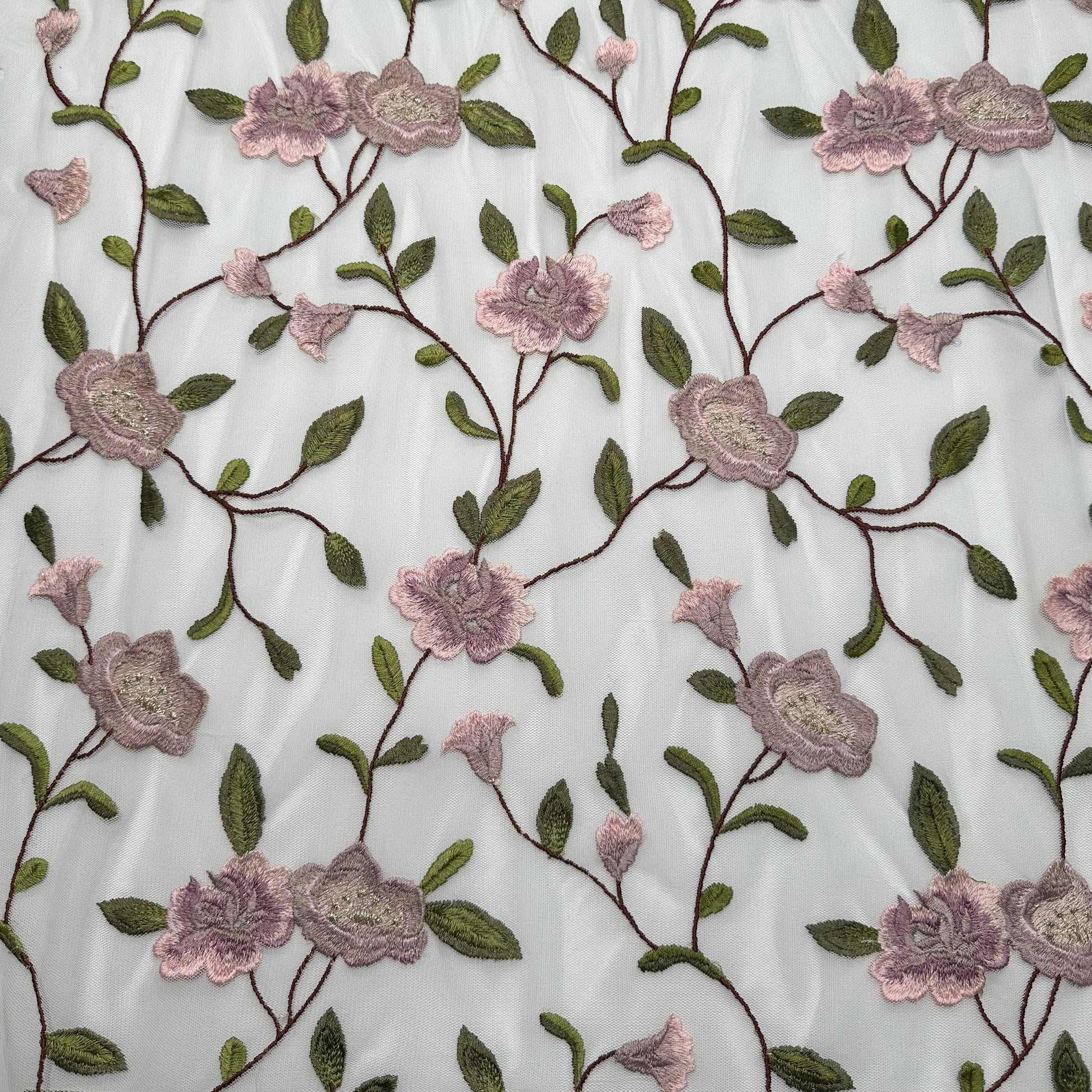 A 3D all over botanical design with flowers in shades of dusky pink and olive green with soft metallic gold accents on an ivory coloured tulle base.