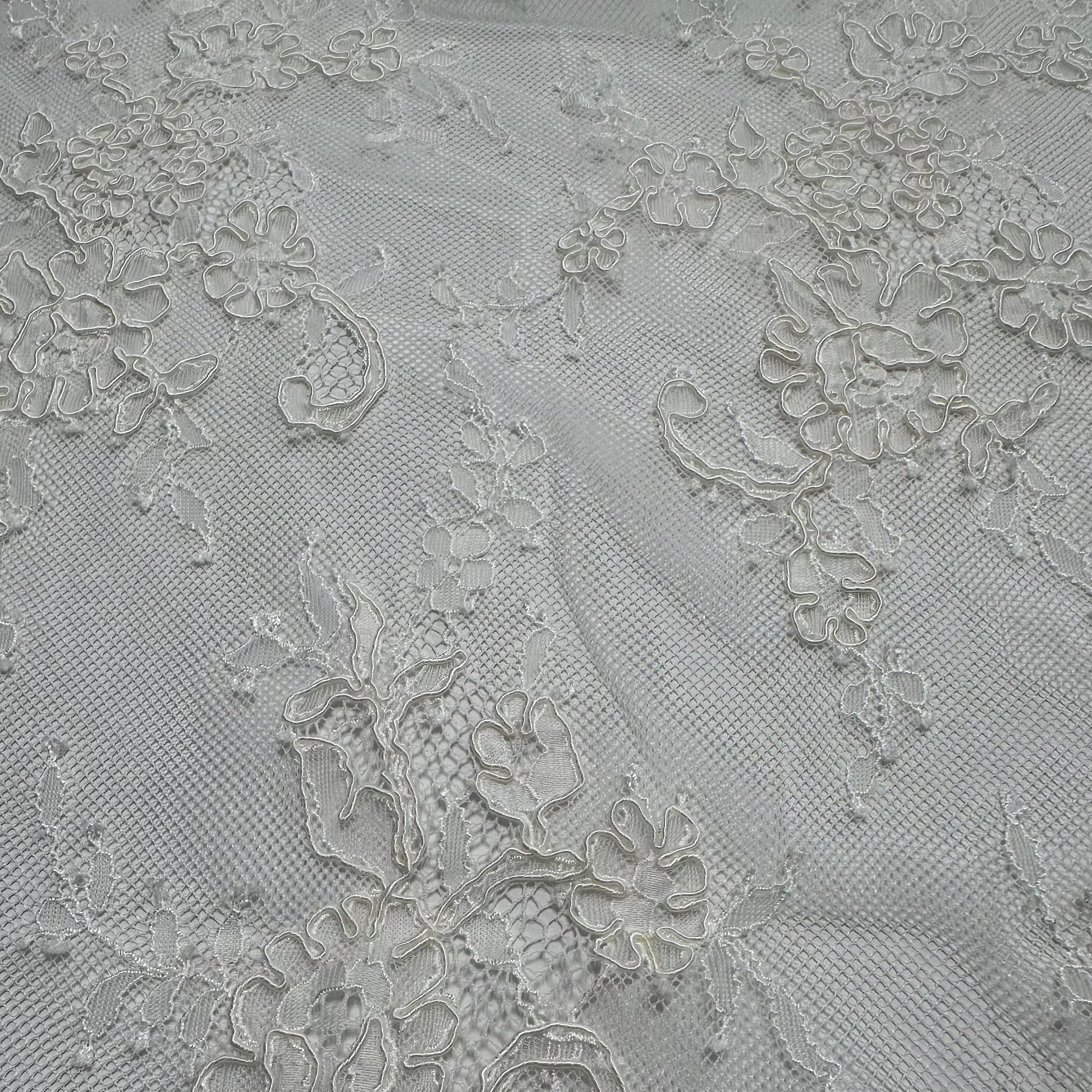 A rich ivory corded Chantilly lace with a double scalloped edge and all-over design.