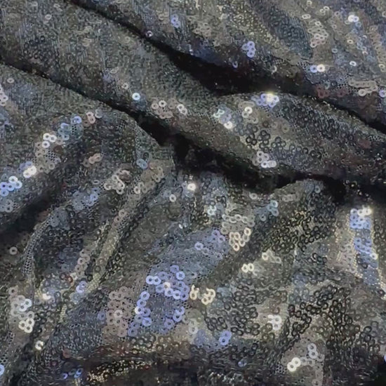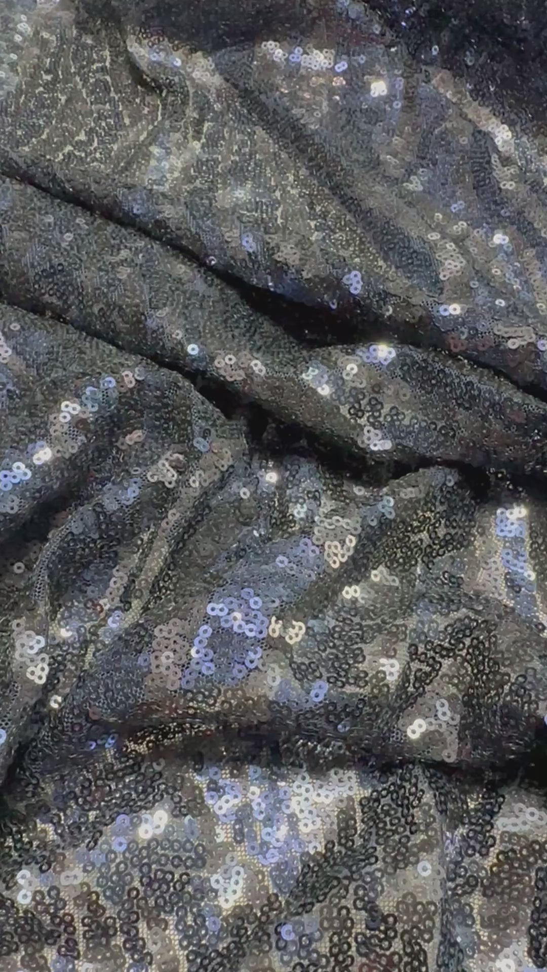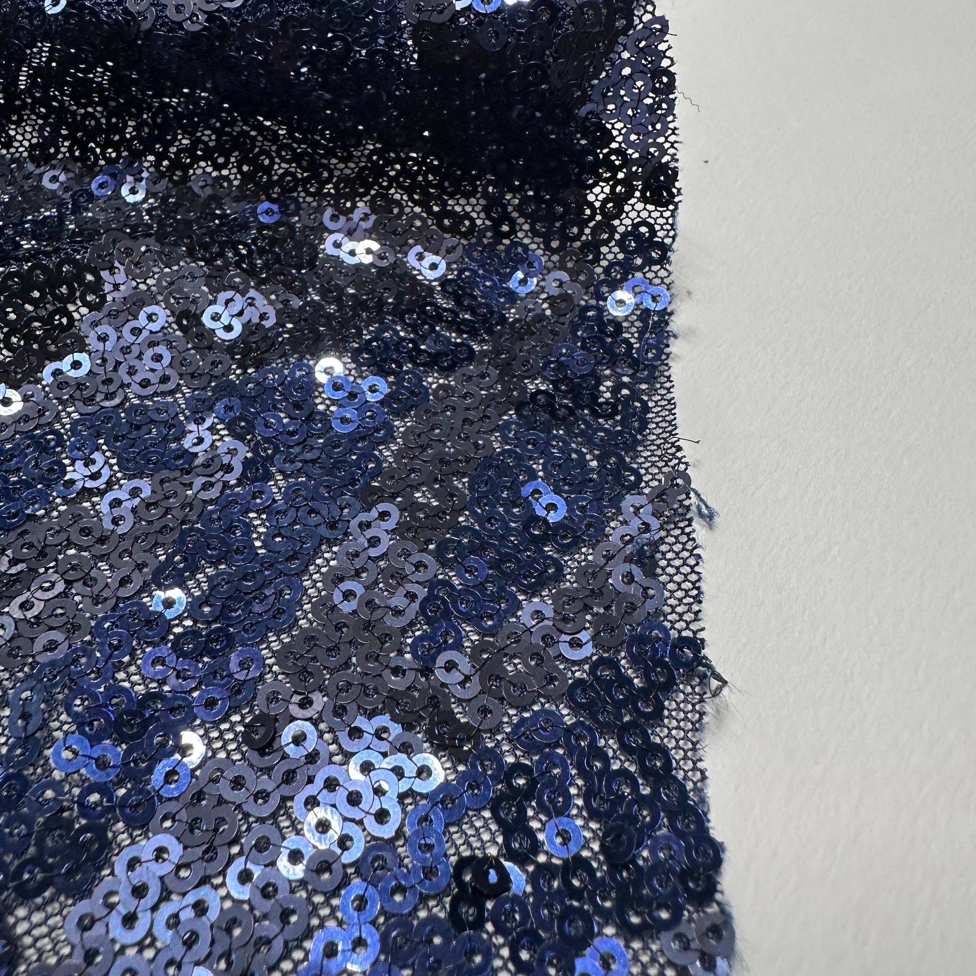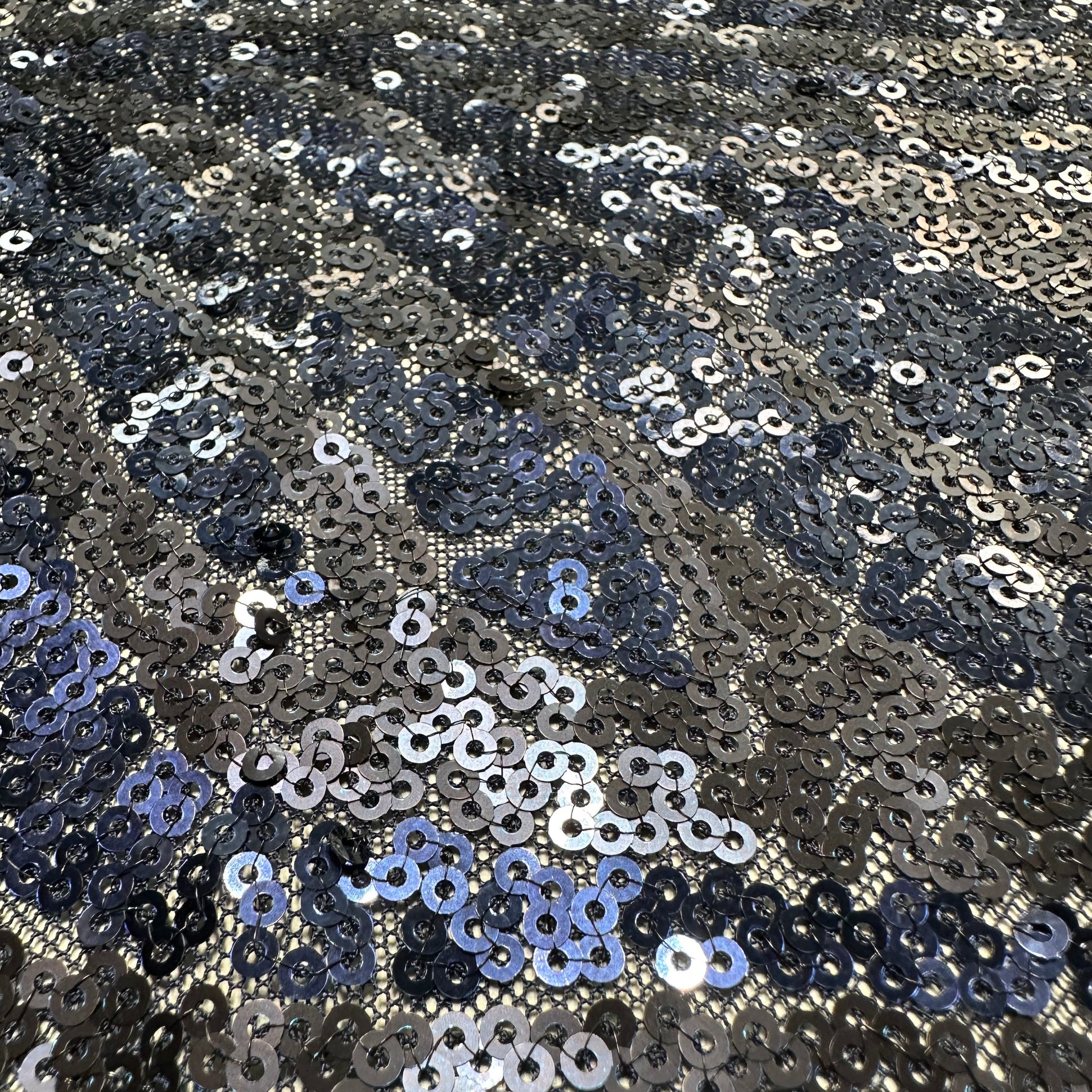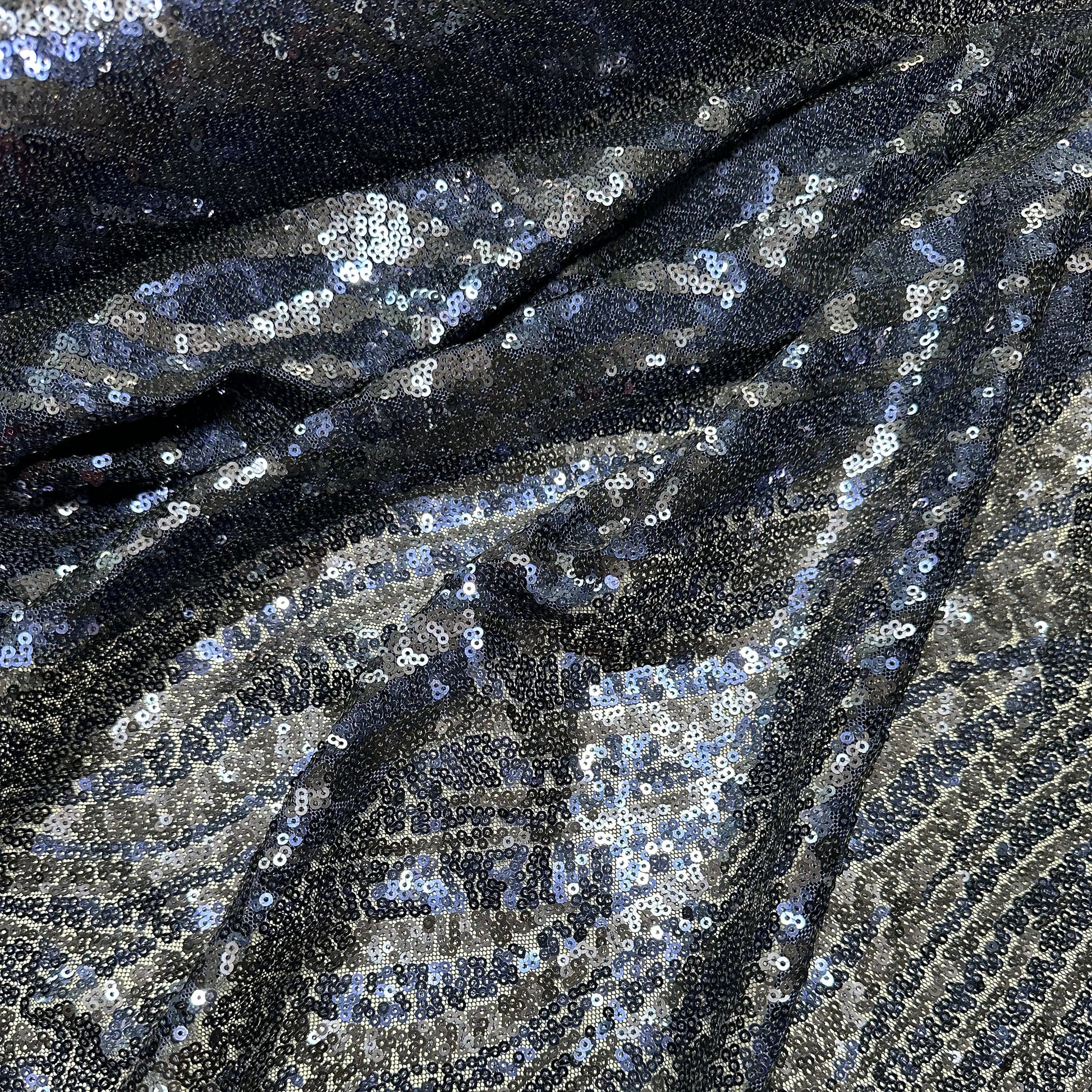 An all over duo-coloured sequinned fabric in navy and black sequins, in a subtle tiger pattern placed on a black stretch net backing fabric. Fabric runs length wise and is predominantly more blue in colour than black.