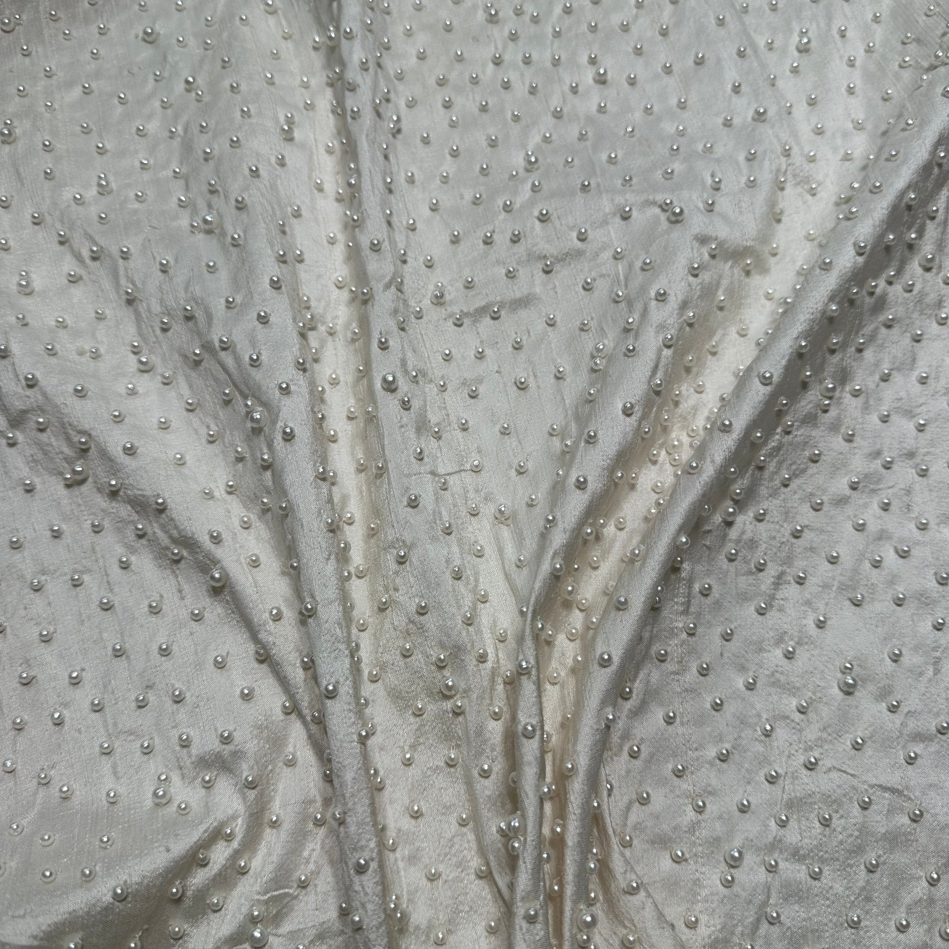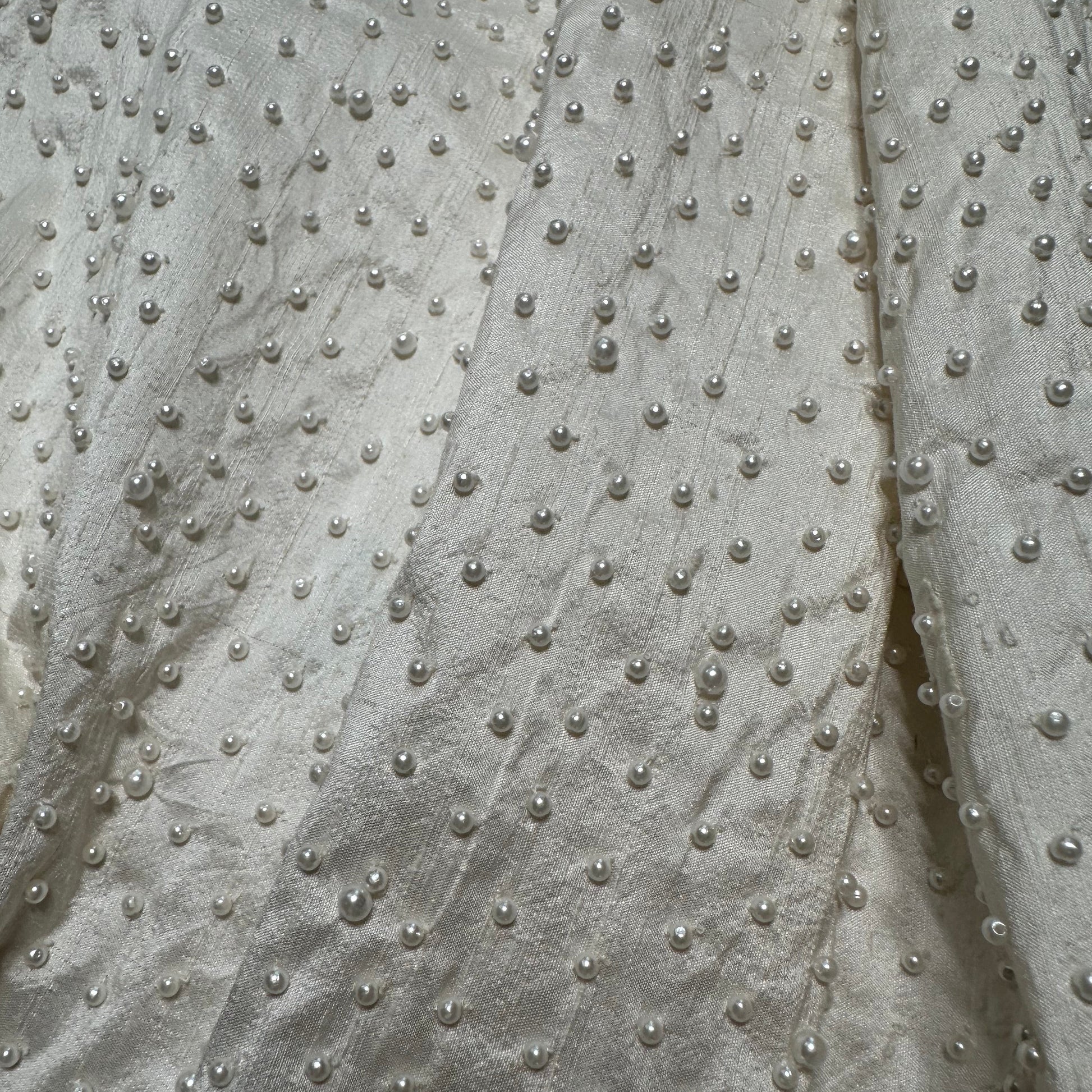 This is a rarely found fabric, a hand embroidered fat quarter with small ivory pearls hand sewn onto Handloomed Dupion silk in Ivory.